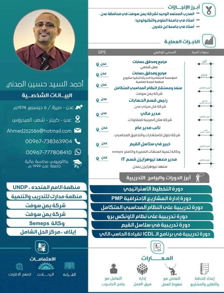 مراجع ومدقق حسابات لشركات ومؤسسات ومنظمات مجتمع مدني في اليمن ، مدرب معتمد للعديد من الشركات البرمجية الرائدة في مجال الحسابات