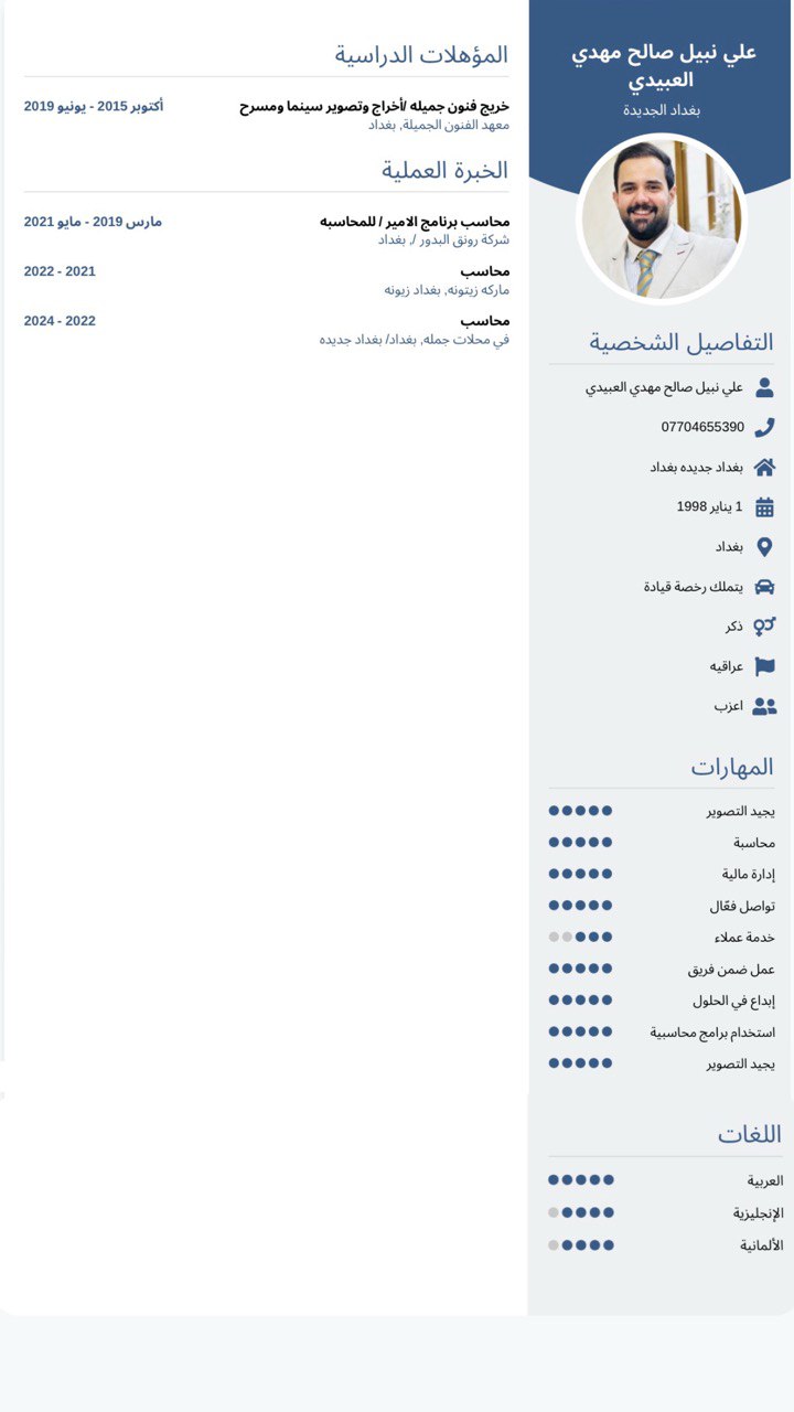 علي من بغداد خريج دبلوم فنون جميله اعمل سابقاً لدى محلات جمله موضف محاسب HR