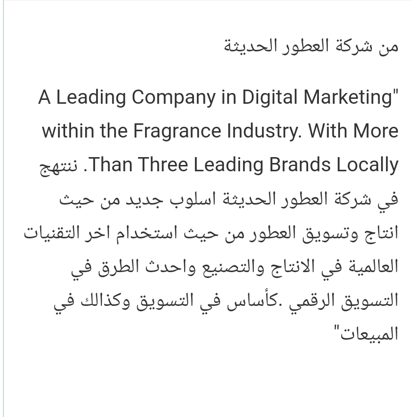 "A Leading Company in Digital Marketing within the Fragrance Industry. With More Than Three Leading Brands Locally. ننتهج في شركة العطور الحديثة اسلوب جديد من حيث انتاج وتسويق العطور من حيث استخدام اخر التقنيات العالمية في الانتاج والتصنيع واحدث الطرق في التسويق الرقمي .كأساس في التسويق وكذالك في المبيعات"