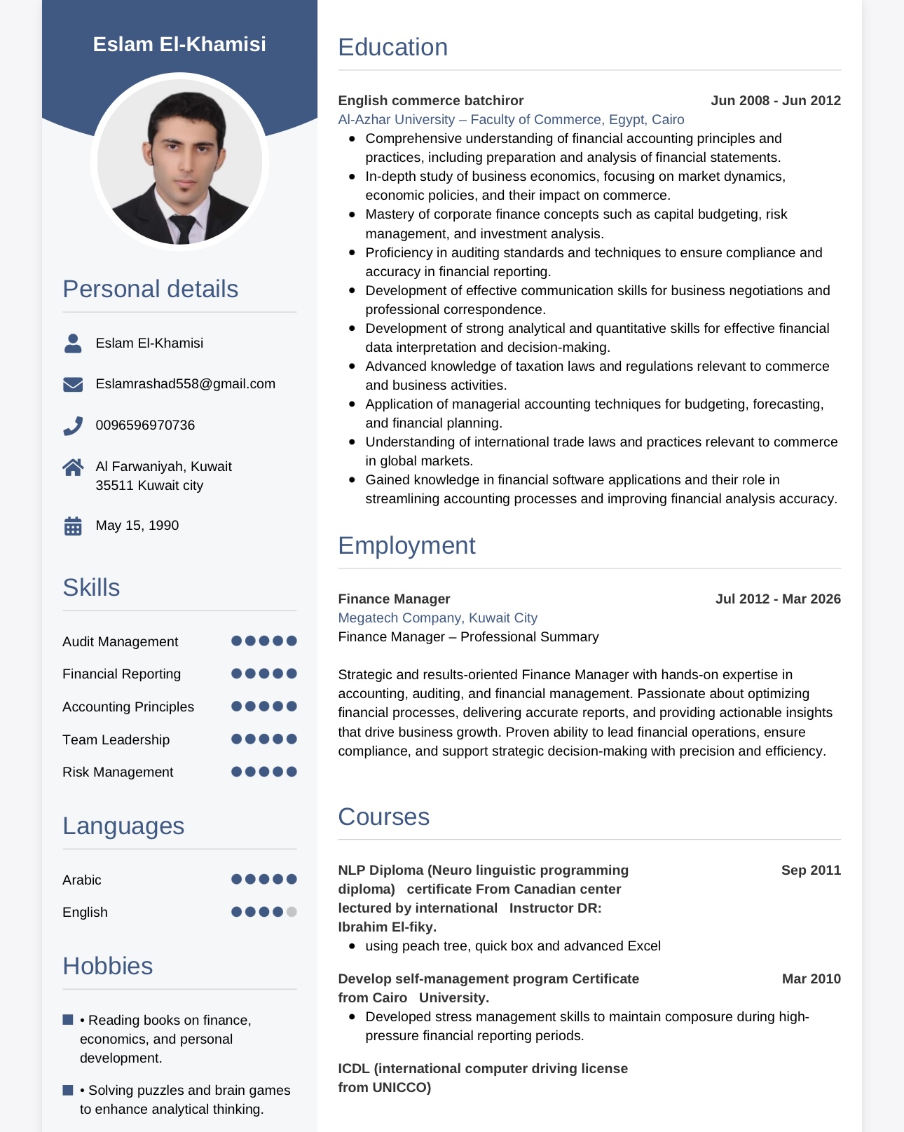 محاسب مالي يتمتع بخبرة في إعداد التقارير المالية وتحليل البيانات، مع القدرة على إدارة الحسابات بدقة والالتزام بالمعايير المحاسبية لتحقيق أفضل نتائج مالية.