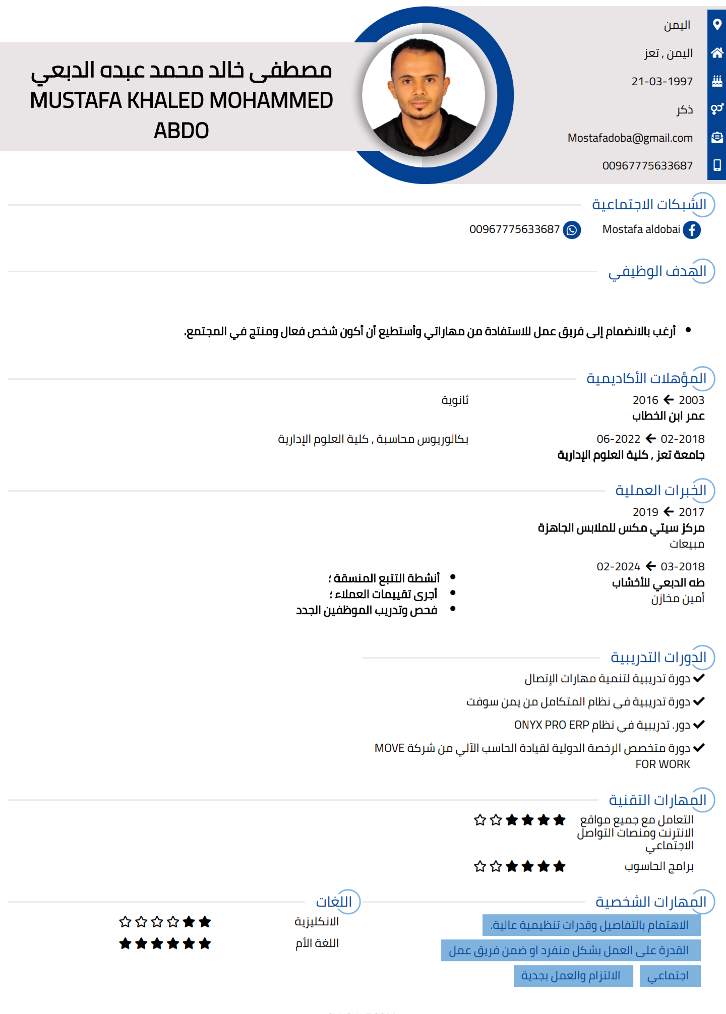 • عملت لدى طه الدبعي للاخشاب كأمين مخازن فترة الدراسة مستمرا حتى الآن
